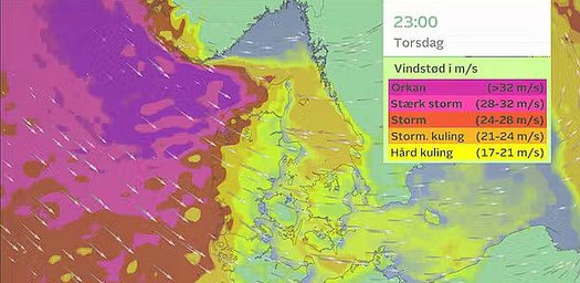 Stormen "Pia" kom forbi. Foto til venstre fra 21.12. er taget fra nord mod syd - redningshusets platform øjnes mod syd. Vindstød på op til 36 m/sek. På vejrkortet så det ud som nedenfor.